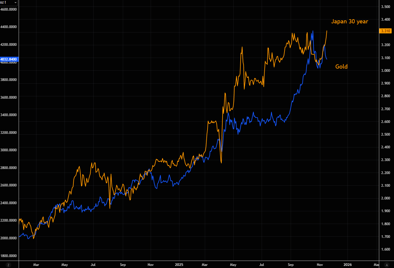 Short term gap between Japanese long end and gold getting rather wide. Gold remains "heavy" given the extreme speculation we saw during the melt up earlier this autumn, but the move in rates is a positive for gold, ceteris paribus.