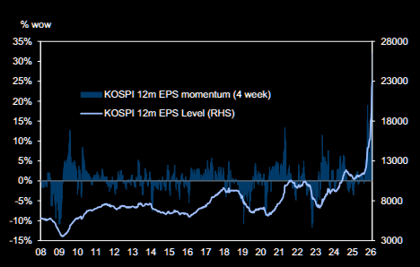 1. Earnings momentum is accelerating sharply: after +36% growth in 2025, 2026 earnings are now forecast at +120% (vs. +115% consensus), up from just +30% expected late last year.