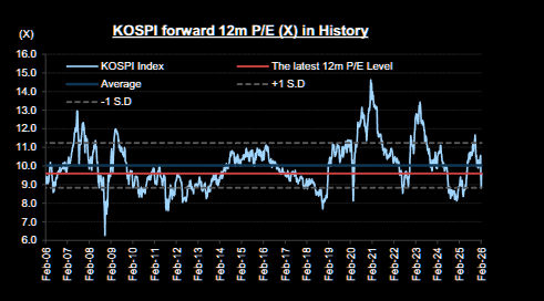 KOSPI 12m forward P/E multiple has remained below its historical average.