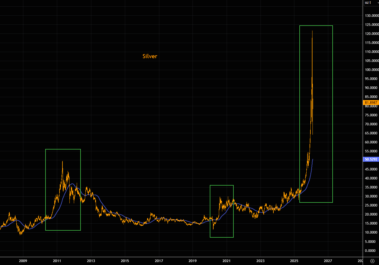 As we’ve been writing, parabolic moves often end in tears, and silver has been no exception. The key question now is whether price revisits the 200-day MA, as it has during past parabolic unwinds. Chart 2 for the ones that fancy log scales.