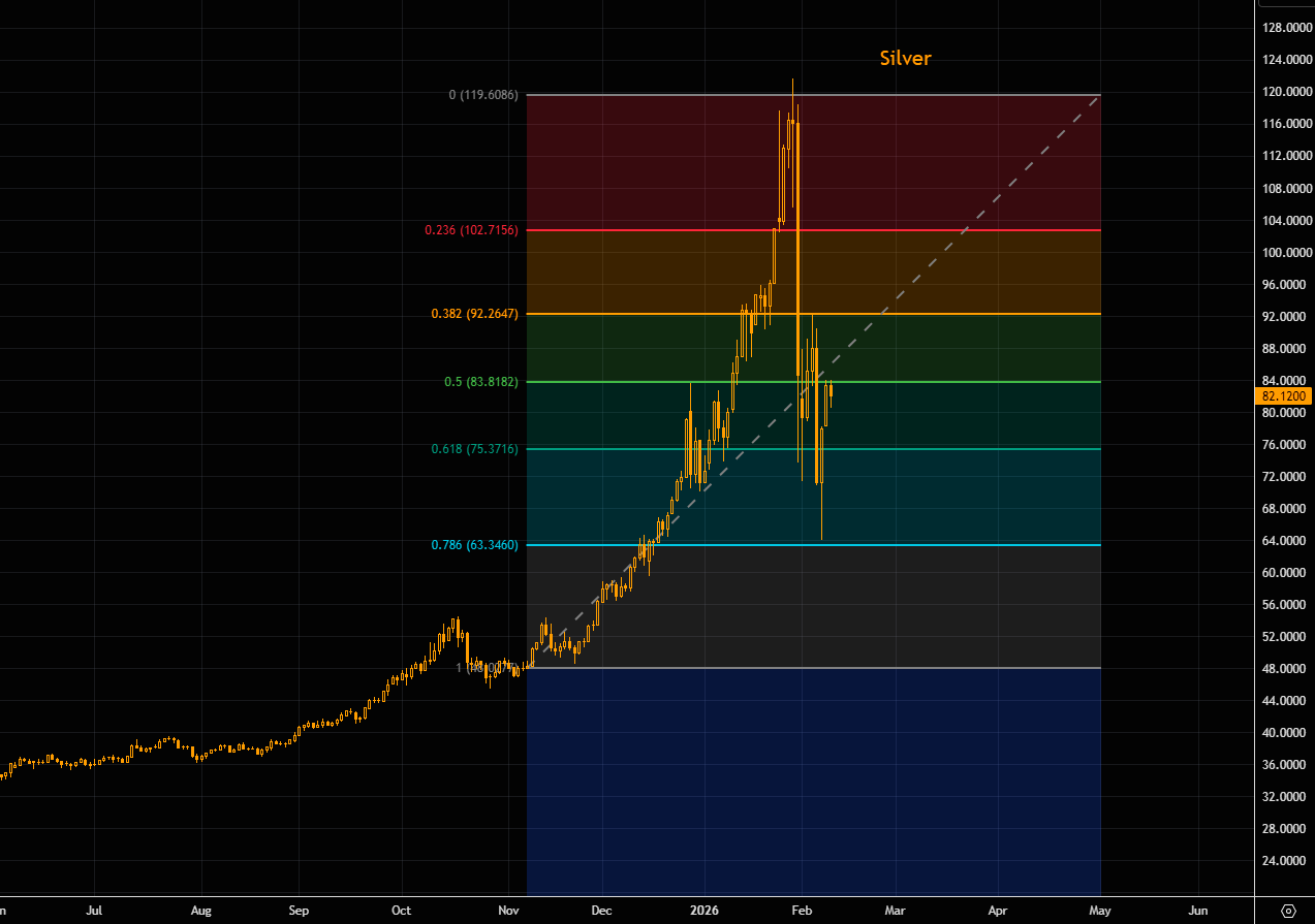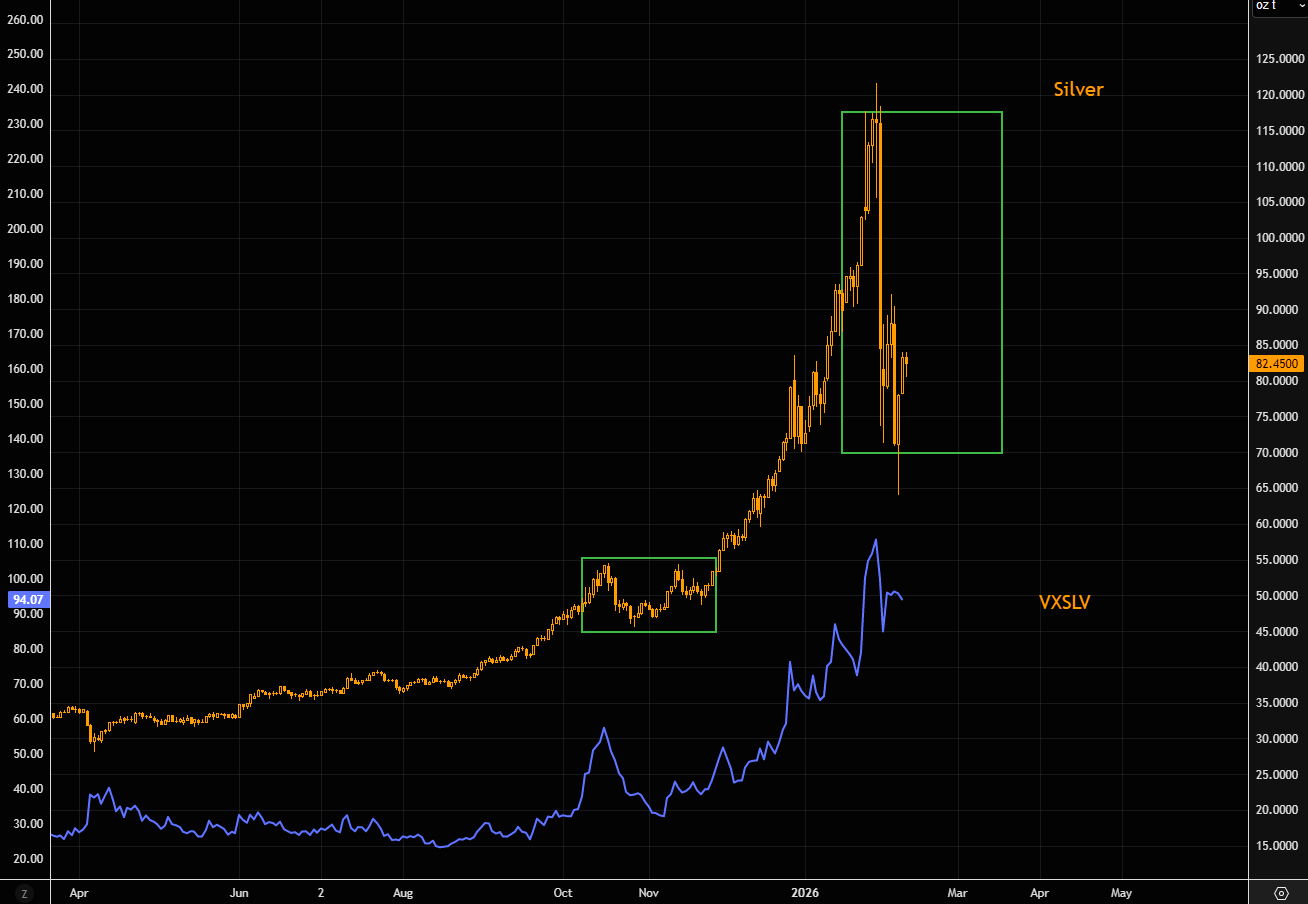 We’ve written extensively about how extreme, and ultimately broken, silver volatility became during the upside panic. These kinds of volatility shocks take time to work through the system. The October upside panic, which was mild compared to the latest squeeze, took more than a month to fully flush. Expect more erratic two-way price action as this shock continues to feed through. For those expecting silver to range, there should be ample opportunities to collect theta, with silver volatility still pricing roughly 6% daily moves.