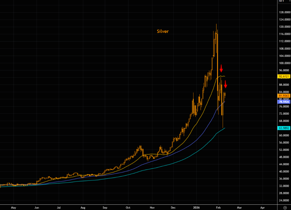 Silver drew in heavy chasing with little conviction or plan, leaving many investors stuck holding positions they now hope can get back to breakeven. Technically, silver bounced to the 21-day MA, rolled over, then found support near the 100-day, but the latest rebound is losing steam. The setup risks forming a second lower high.