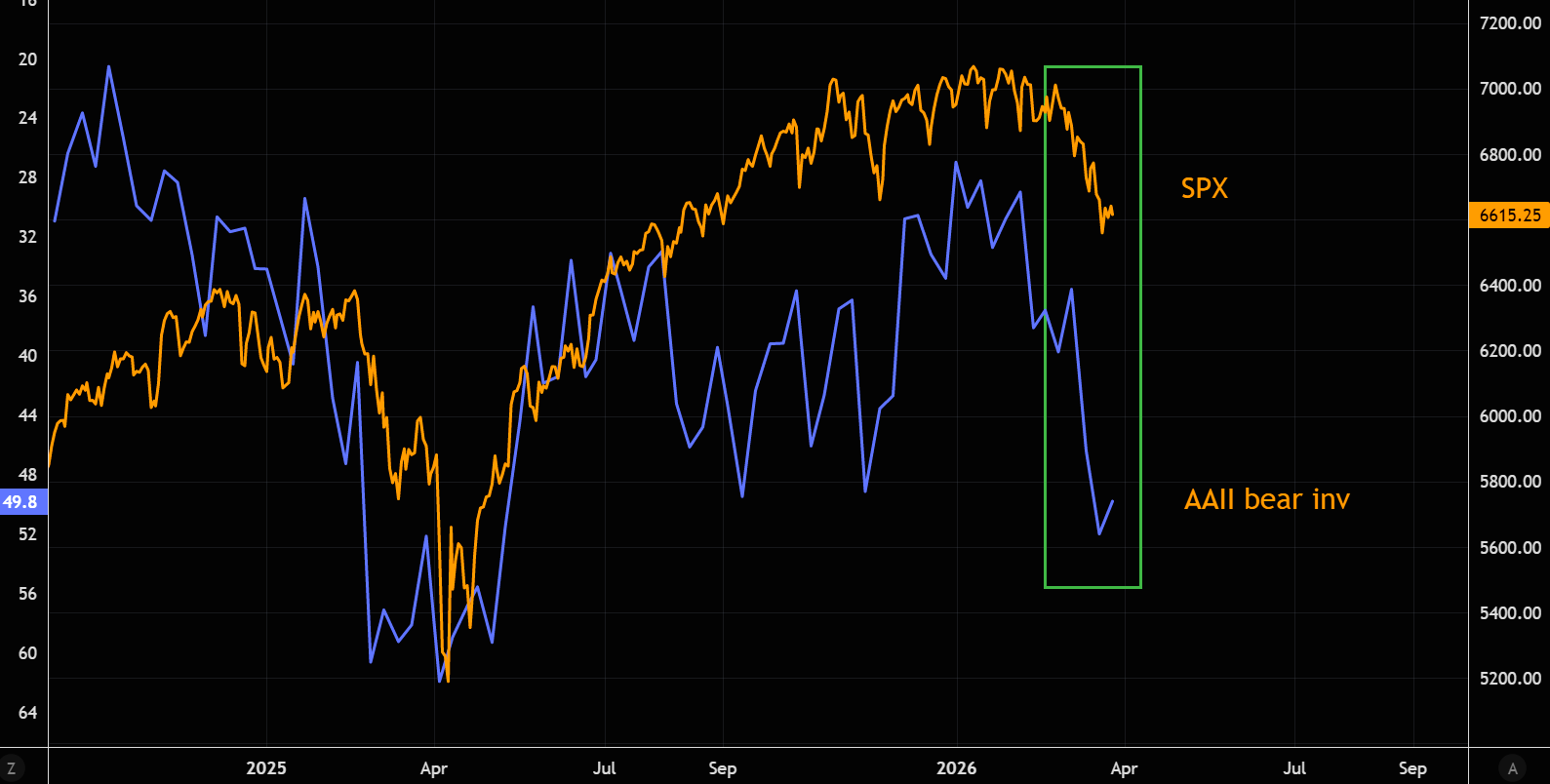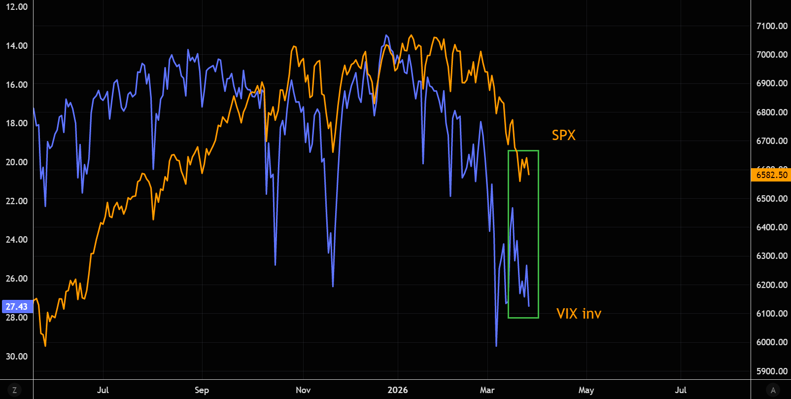 The SPX vs. VIX inverted gap remains wide. The initial VIX overshoot has normalized while SPX has drifted lower, but the persistent gap should keep you on alert.