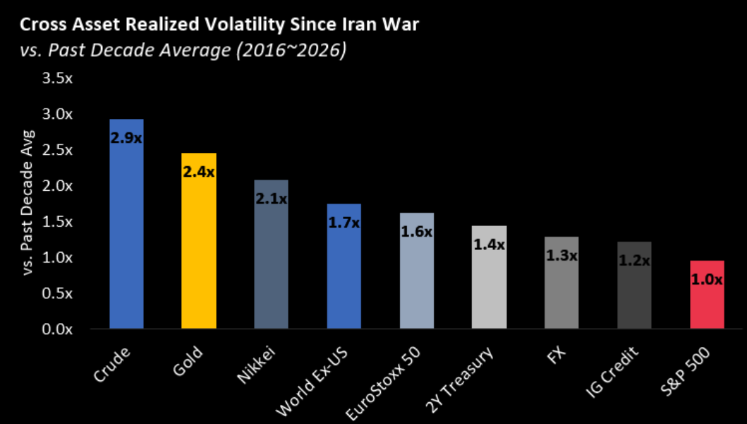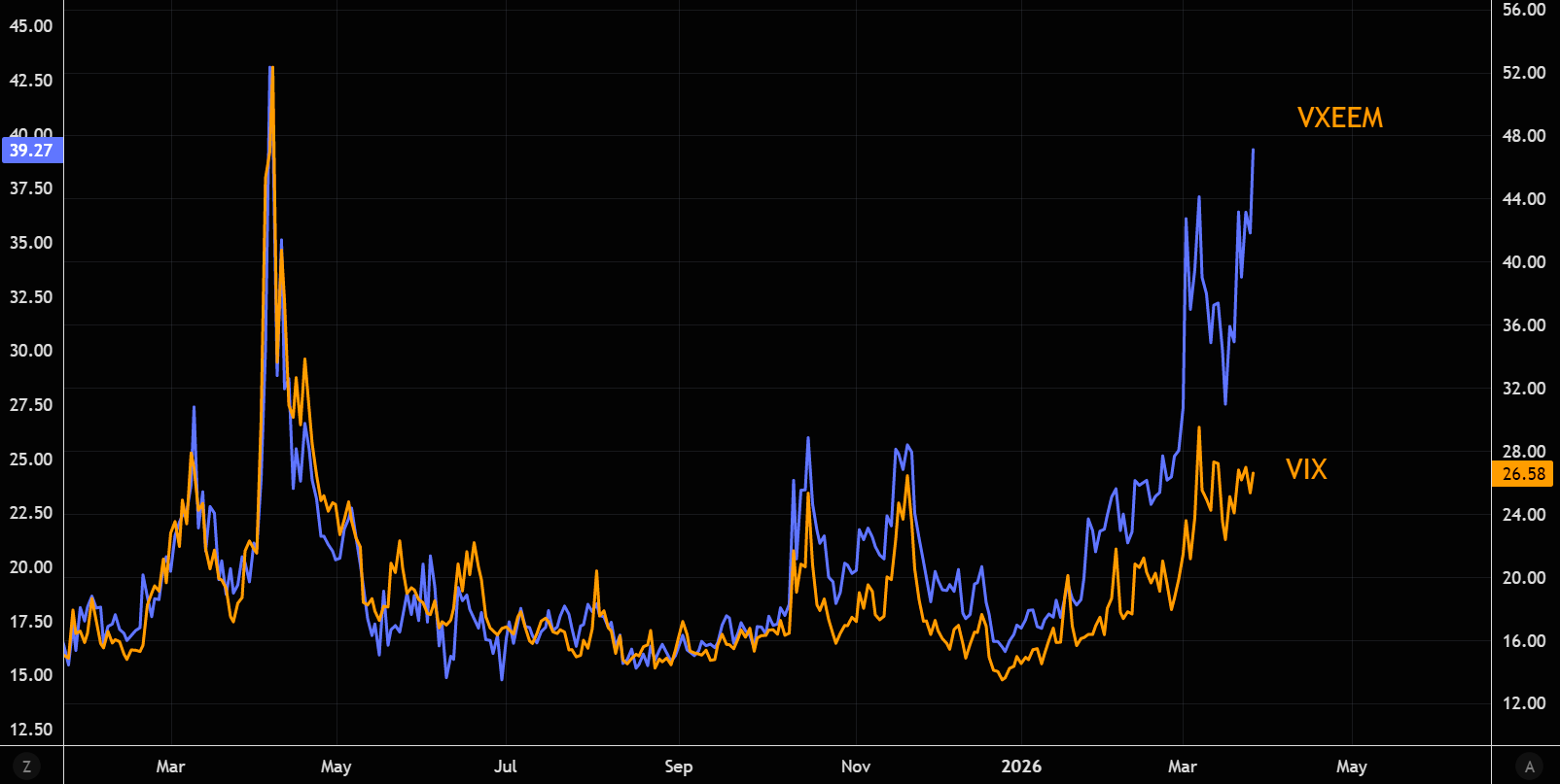 The current Middle East crisis is hitting the more sensitive parts of the market. One clear example is the surge in EM volatility, both in absolute terms and relative to developed markets.