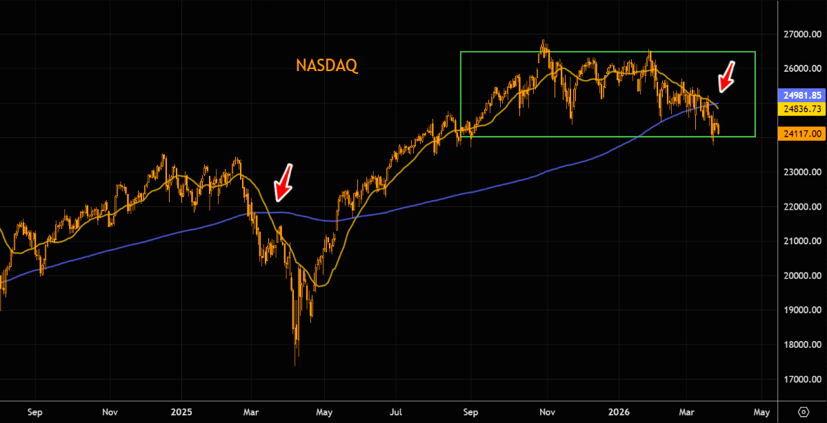 NASDAQ futures are not far from the key 24k support. The 21-day crossed the 50-day a few sessions ago, leaving us at clear make-or-break levels.