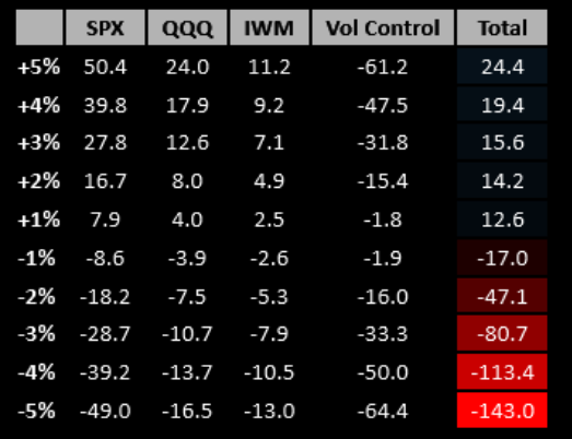 Scenario projections for options + levered ETF dealers and volatility control funds. Down big comes with big selling needs.