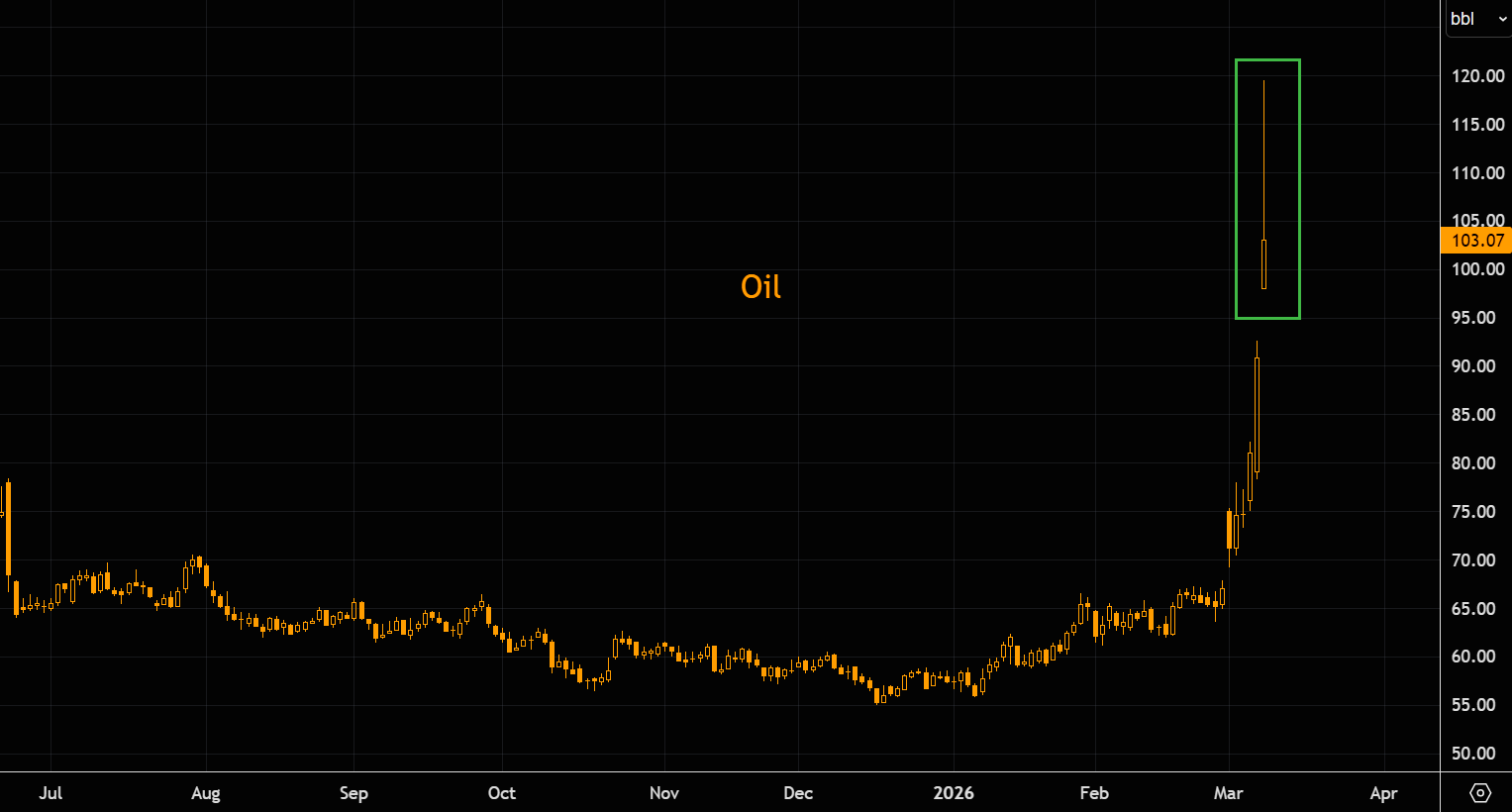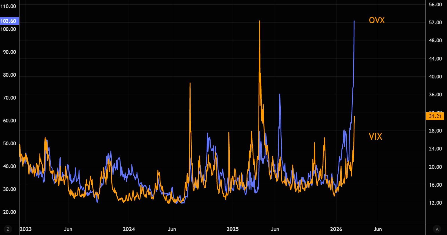 Oil volatility closed at 103.6 on Friday (today’s update pending). The market is pricing roughly 6.5% daily moves going forward. That is extreme, and remember that volatility cares about pace, not direction. Expect erratic price action, both ways, for longer.