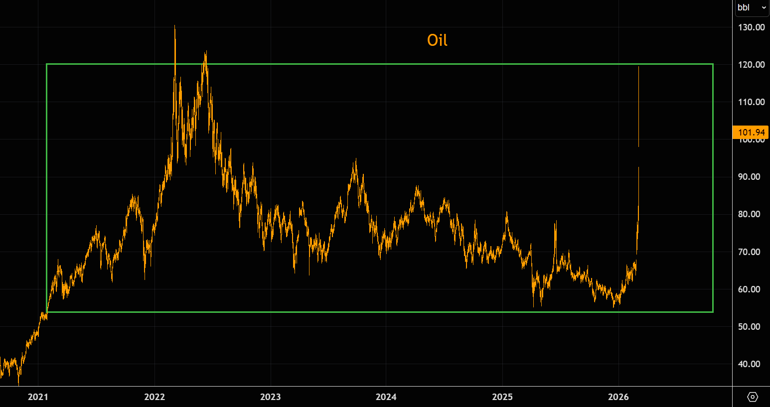 We did not expect oil to explode in this fashion, but remember that oil typically mean-reverts over time, and chasing extremes is usually a very costly strategy. Notably, we essentially kissed the 2022 highs during today’s panic spike. The squeeze has now gone far beyond the technical breakout.
