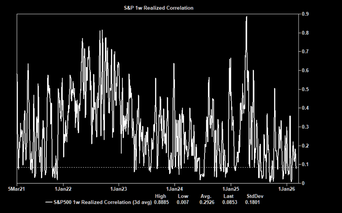 One-week realized correlation remains extremely low… right around the 10th %tile on a five year lookback.