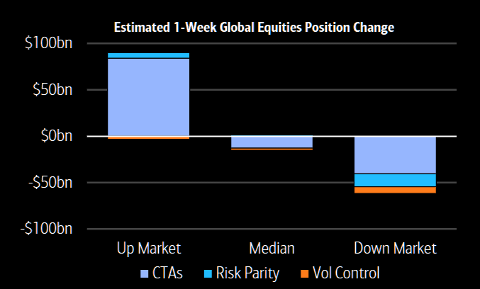 Risk is now two-sided with systematic flows buying on the upside or continuing to sell on the downside. Systematic strategies could sell $62bn in a down market, sell $14bn if markets are flat, and buy $87bn in an up market.