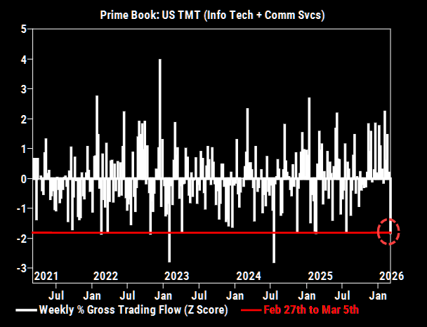 In % terms, this week’s de-grossing activity in US TMT (Info Tech + Comm Svcs) was the largest since Jul ’24 and one of the largest in the past 5 years (-1.8 z score).