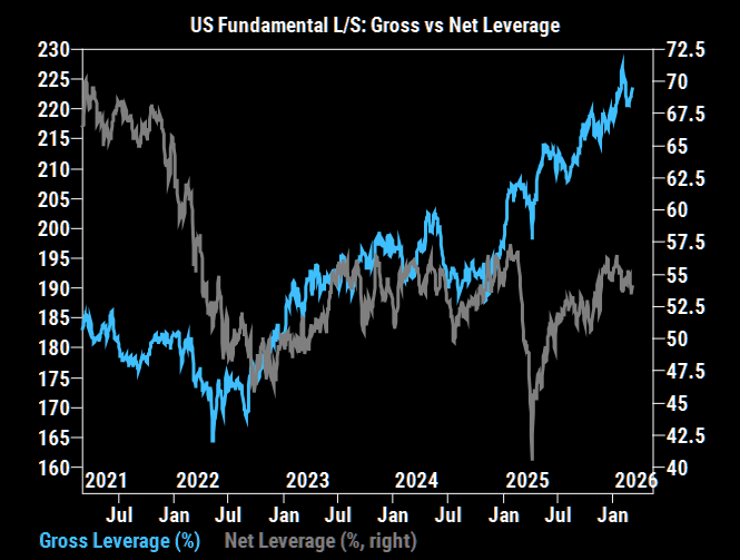 3. US L/S Gross leverage increased +2.1 pts to 224.5% (97th percentile one-year), while US L/S Net leverage rose +0.5 pts to 54.8% (82nd percentile one-year).