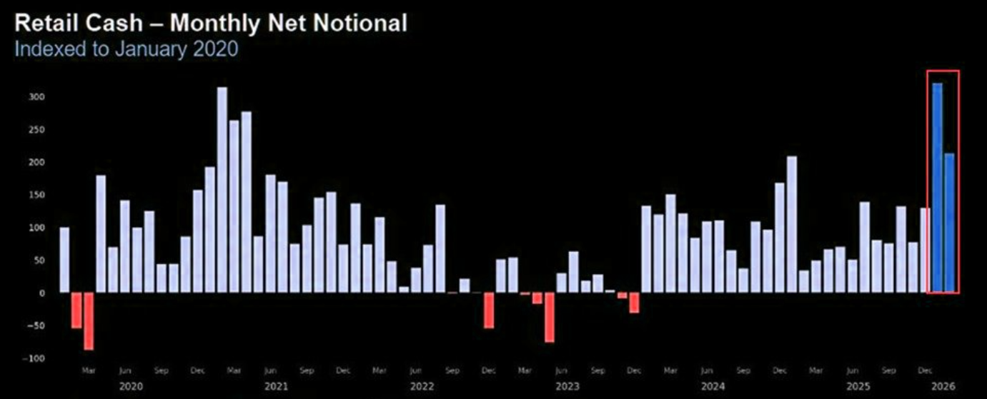February was the 5th-strongest month on record for individual investor equity purchases. Retail investors have now purchased stocks for 26 consecutive months. Furthermore, average daily retail options volumes in 2026 are now +14% above 2025 levels. This is also up +47% compared to the 2020-2025 average.