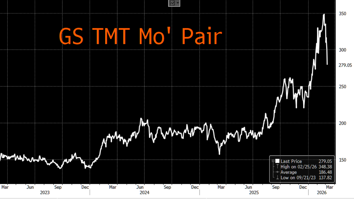 GS TMT Momentum Pair (leaders vs. laggards) closed down ~16% on the week, it’s worst week since November of 2022. The pair has gone from being technically ‘over bought’ at the end of February, to now, nearly in ‘oversold’ conditions).