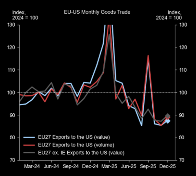 "The replacement of IEEPA tariffs with a new 15% global tariff would raise the US effective tariff rate on the EU by 0.9pp to 12.1% and by 2.9pp to 10.9% for the UK but would be essentially neutral for Switzerland and Norway, although uncertainty remains elevated on a number of dimensions."