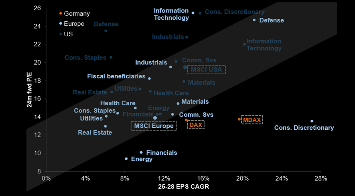 German indices remain relatively cheap for their growth. Consensus forecasts 14-20% earnings CAGR over the next few years for Germany.