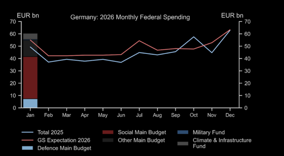 "German federal expenditures in January came in at EUR 60.4bn, about EUR 5.4bn above our expectations and EUR 11.1bn above January 2025. The strong start to federal spending in 2026 supports our view of a notable fiscal expansion this year, which we expect to contribute around 0.5pp to our growth forecast of 1.1% this year."