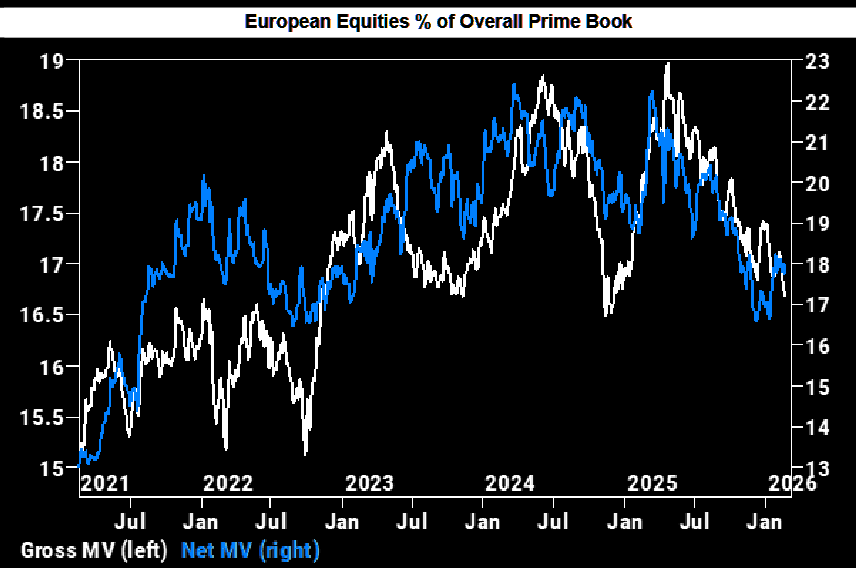 HFs net sold European equities at the fastest pace in 5 months. The net selling was driven by long sales and to a much lesser extent short sales (5 to 1).