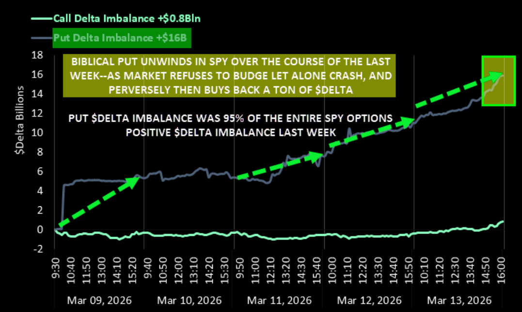 Short-dated S&P downside hedges keep getting unwound in waves writes McElligott. As a proxy, last week’s net $delta imbalance in SPY options shows positive delta from sold puts massively outweighing call delta, as the market simply refused to crack.