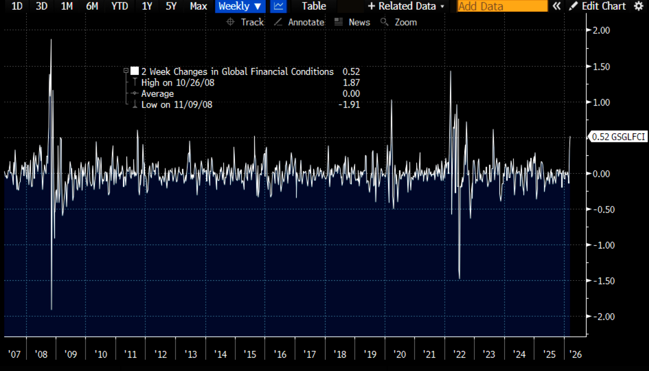 The biggest development over the past two weeks has been the sharp tightening in global financial conditions. The GS Global FCI has risen more than 50bps over that span – the strongest tightening impulse since August 2023 and one of the largest moves outside of true crisis periods.