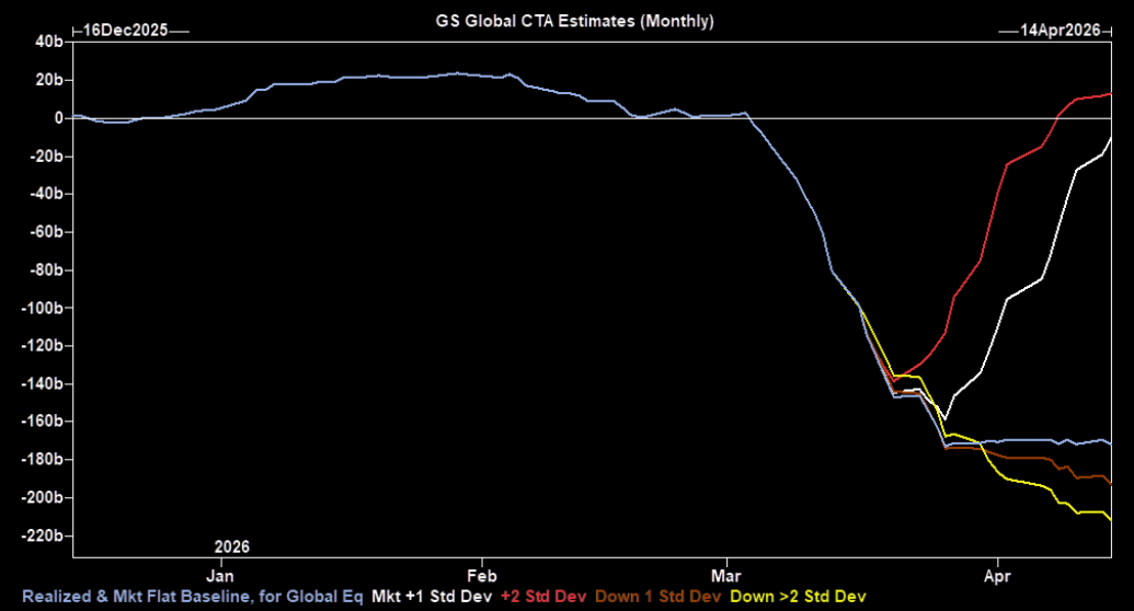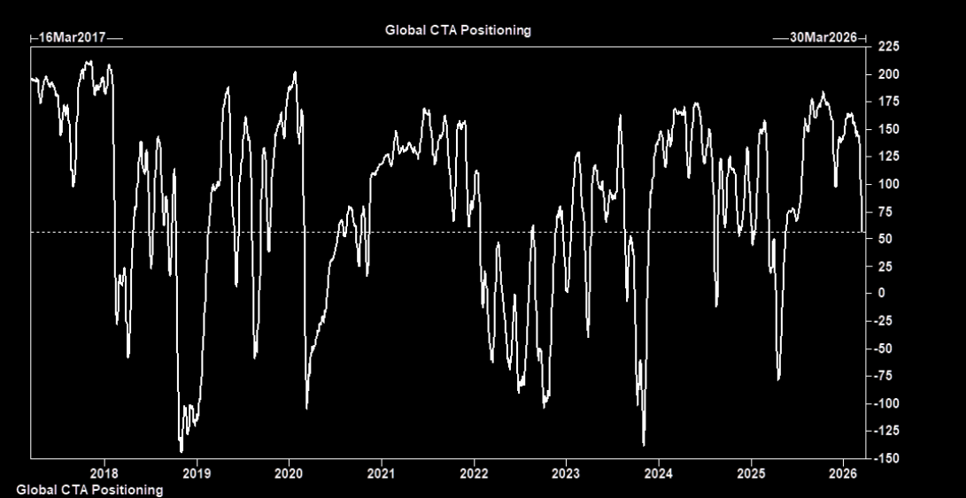 Goldman Sachs estimates the community has sold about $80bn of global equities over the past month, with CTAs and trend followers driving the bulk of the selling in the past week. In its baseline scenario, GS sees another $70bn of selling over the next week and roughly $100bn over the next month. Overall positioning has already dropped from above 8/10 earlier this year to around 6.5, and could move closer to 4.5–5 if those flows play out.