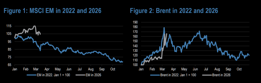 If this resembles the Ukraine shock, oil may not fade quickly. Back then, Brent didn’t return to its Jan 1 level (~$77/bbl) for nearly a year, while EM fell over 30% from the peak.