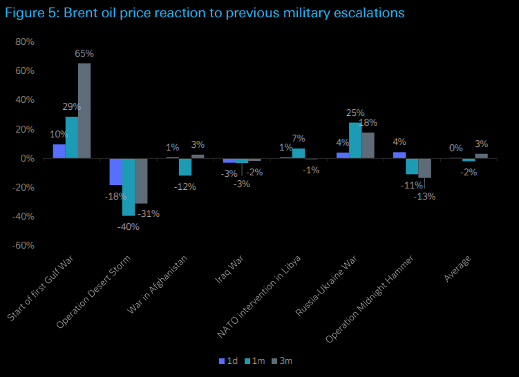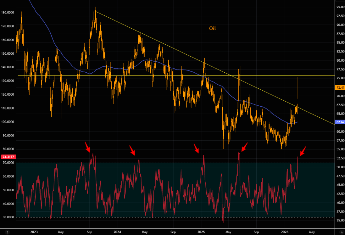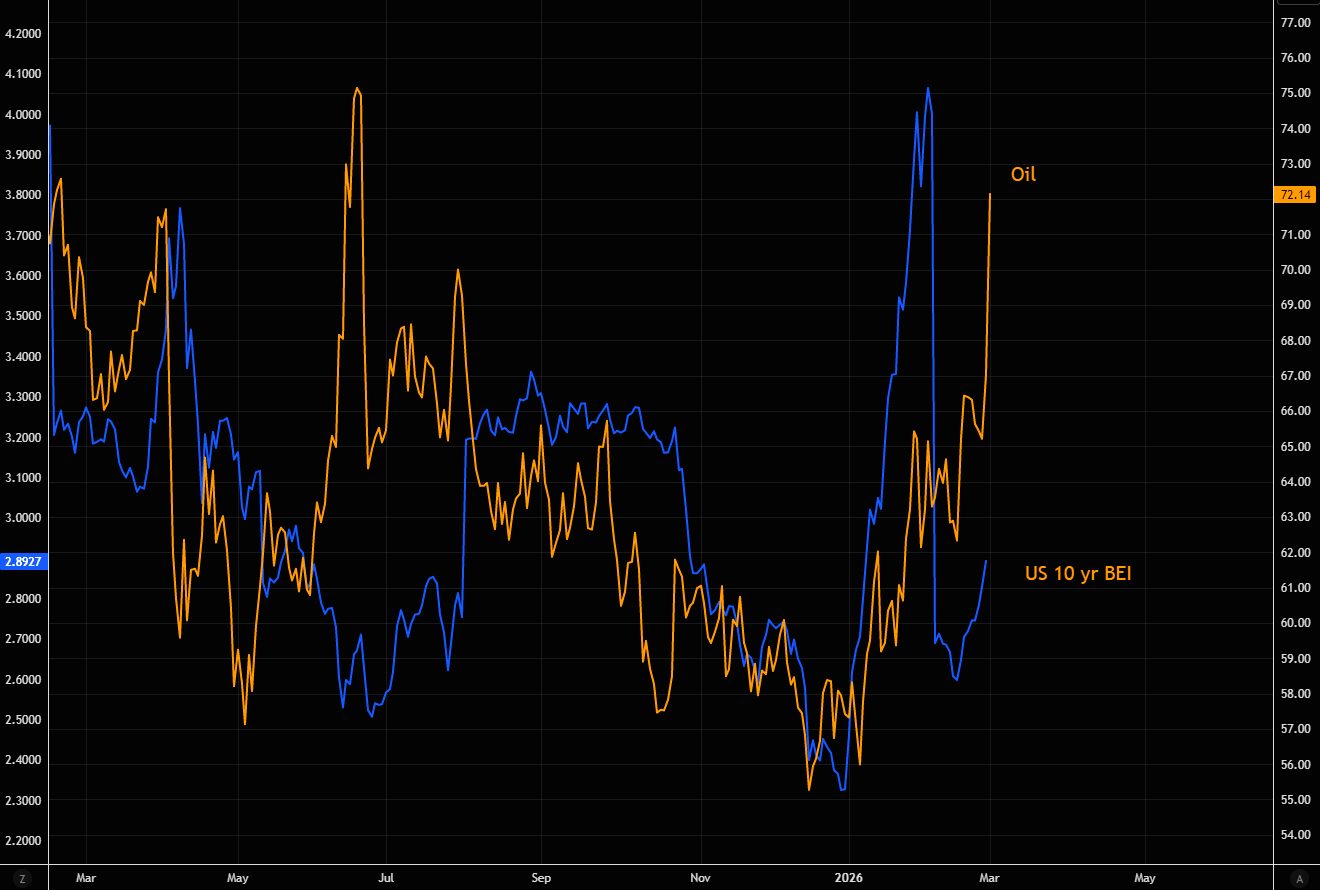 This is their chaos view. Following US/Israeli strikes on Iran and a forceful retaliation, the escalation risks becoming prolonged. Iran’s most potent lever isn’t missiles, it’s oil. Sustained (even partial) disruptions through the Strait of Hormuz could trigger panic and push Brent toward $100–150/b.