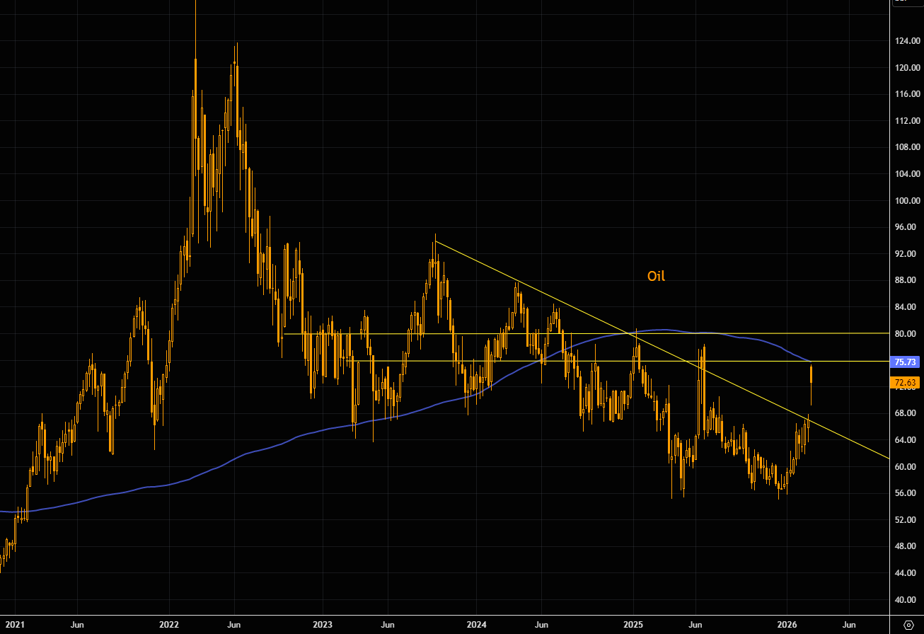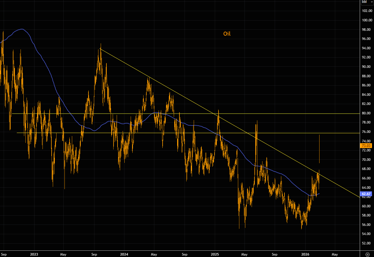 Technically, oil is now trading decisively above the former downtrend line and well above the 200-day moving average. First resistance sits near $76 (almost touched overnight), while initial support comes in around the $70 area.