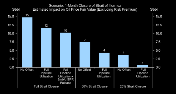 If oil flows through the Strait of Hormuz are disrupted for one month, estimated fair value impacts according to GS are roughly: