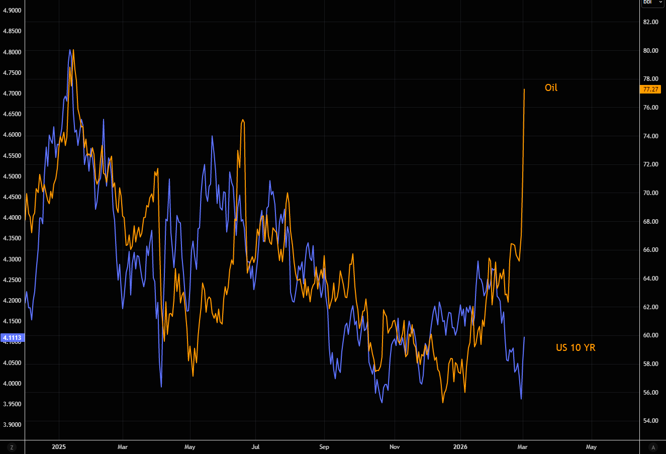 Oil vs US 10 year gap very wide. If oil stays here, something else has to move.