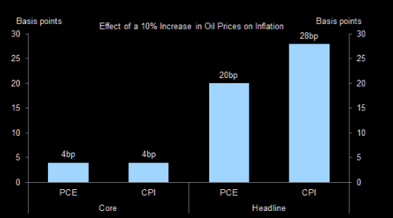 Higher oil prices feed directly into consumer energy costs. As a rule of thumb, a sustained 10% rise in oil tends to lift core CPI by around 4 basis points and headline CPI by roughly 28 basis points, writes GS.