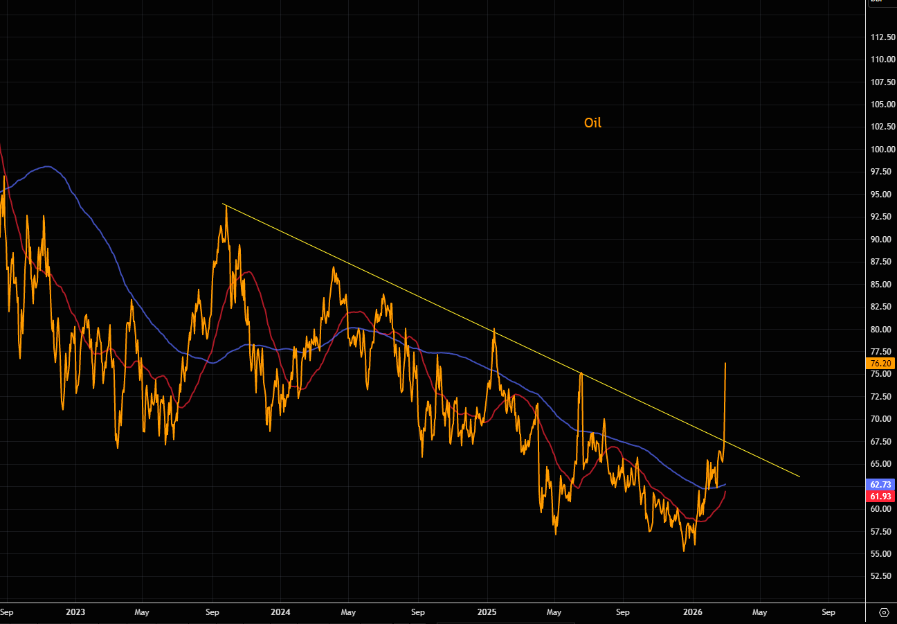 Oil is trading well above the downtrend line that has been in place since September 2023. The 50-day moving average is now close to crossing above the 200-day.