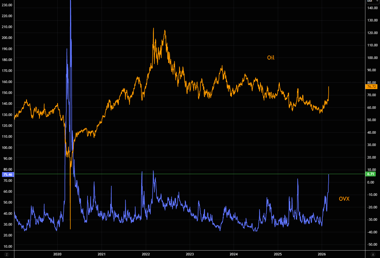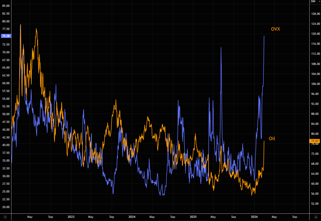 Oil volatility is surging. With OVX at current levels, the market is pricing roughly 4.7% daily moves in crude. That’s not normal volatility, it’s a market bracing for disorder.