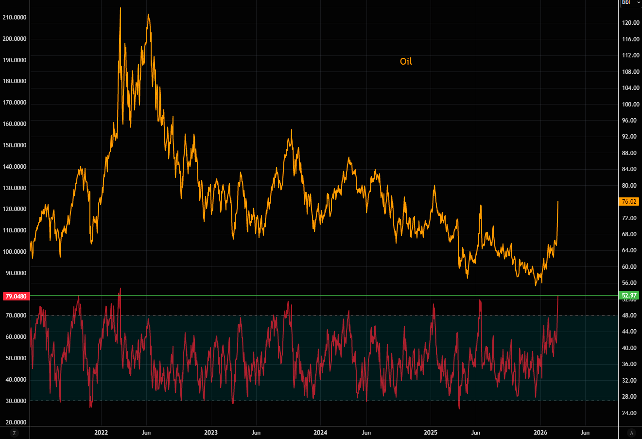 Oil is now at its most overbought levels since March 2022. RSI 79.