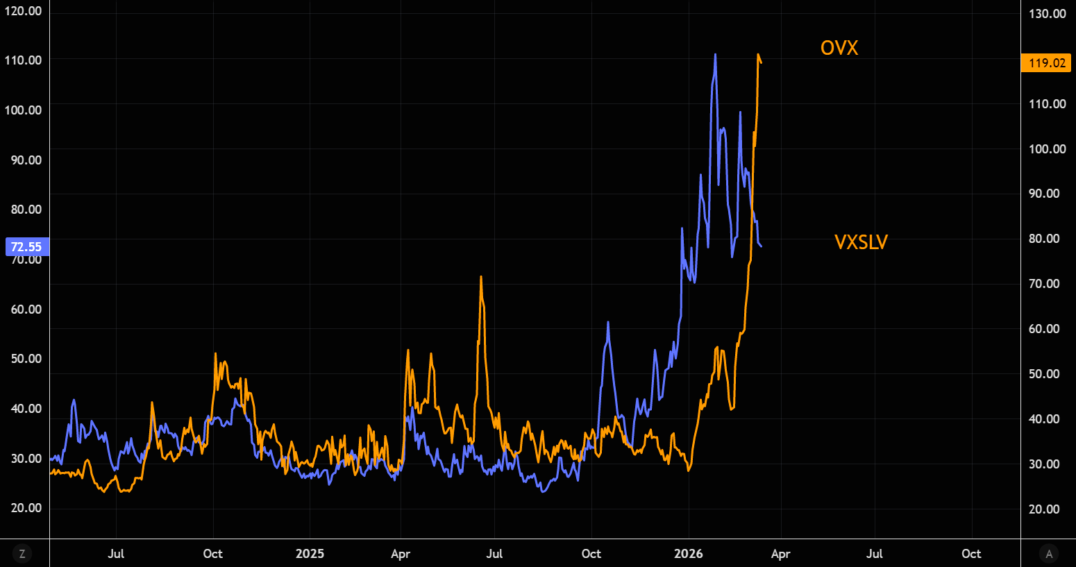 Chart 2 compares OVX with silver volatility. Silver saw a similar panic spike earlier this year, with volatility exploding higher. The hangover phase has been painful, and oil risks following a similar pattern.