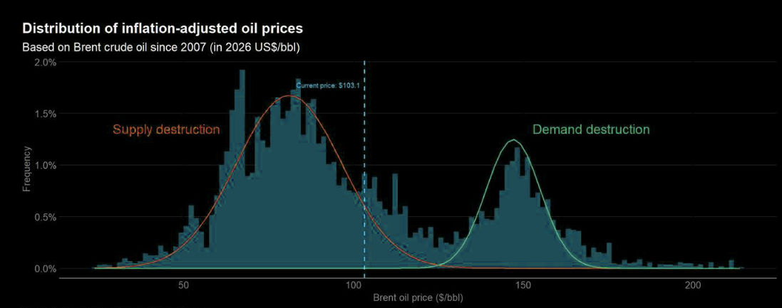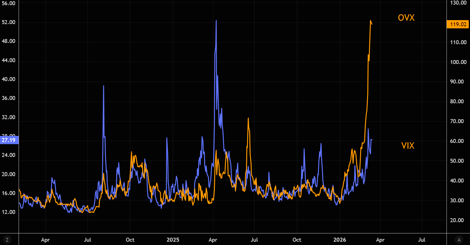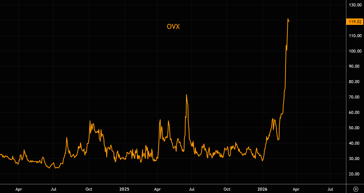 Oil volatility, with OVX around 120, signals a broken market and is unlikely to be sustainable. At these levels the market is pricing roughly 7.5% daily moves. Theta is extremely expensive, meaning oil bulls expressing their view through upside calls may quickly discover how painful that decay becomes on even a pause in oil, not to mention a pullback. Unwinding those expensive calls could also pressure spot.