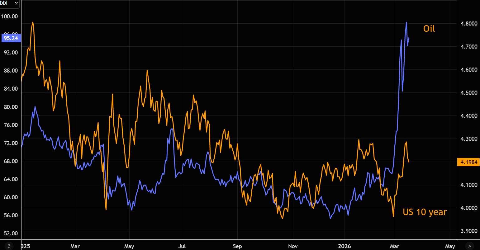 Rates have moved closely with oil, but the 10-year has started to decouple.