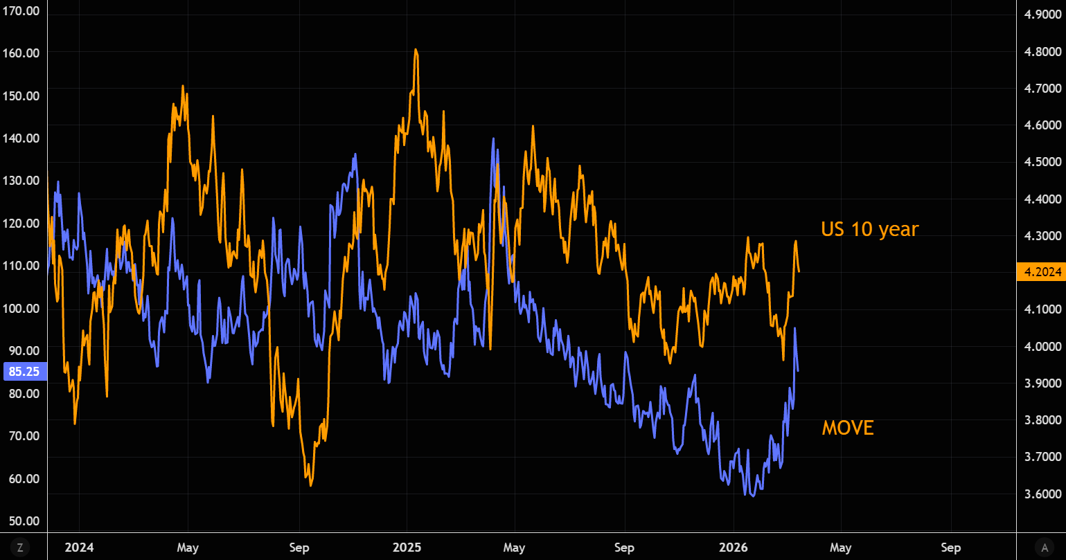 Bond volatility started rising before the latest rate spike. The move has been violent, so a pause looks likely, unless the Iran situation spirals further.
