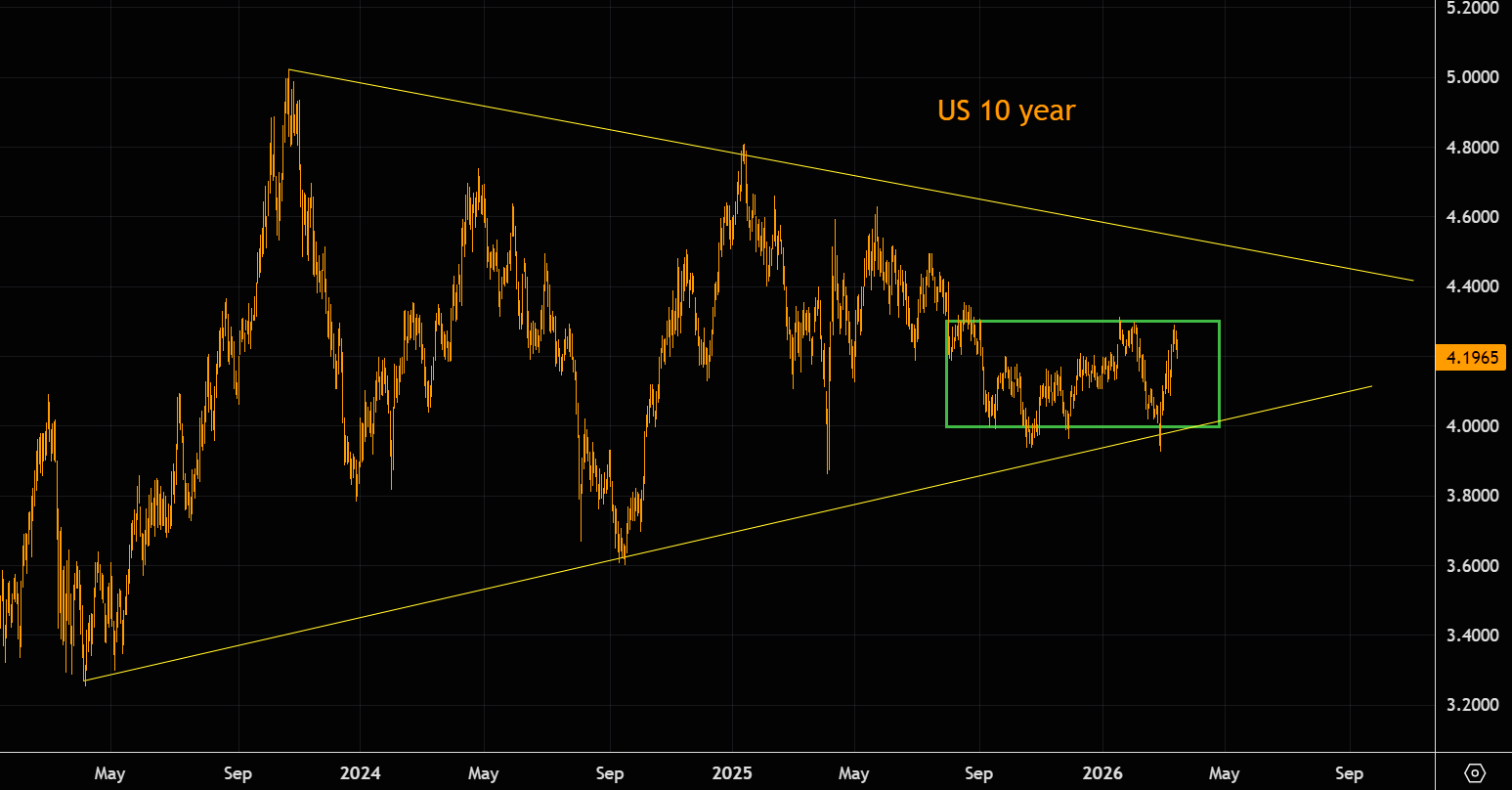 The US 10 year continues trading inside the huge triangle like formation, but this is not breaking out until much later.