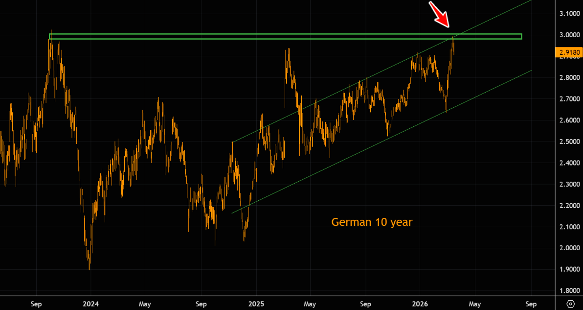 The German 10-year yield reversed right at the key 3% level, aligning with both the 2023 peak and the upper bound of the trend channel.