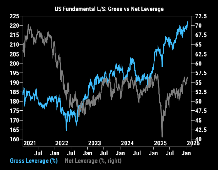 GS Prime: "US Fundamental L/S Gross leverage rose+2.7ptsto 222.3% (100th percentile one-year) ,while US Fundamental L/S Net leverage rose+0.6pts to 55.9% (89th percentile one-year)."