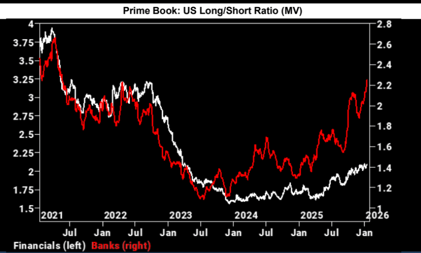 GS: "US Banks long/short ratio now stands at 2.24, which is hovering 3-year highs and ranks in the 93rd percentile vs. the past five years."