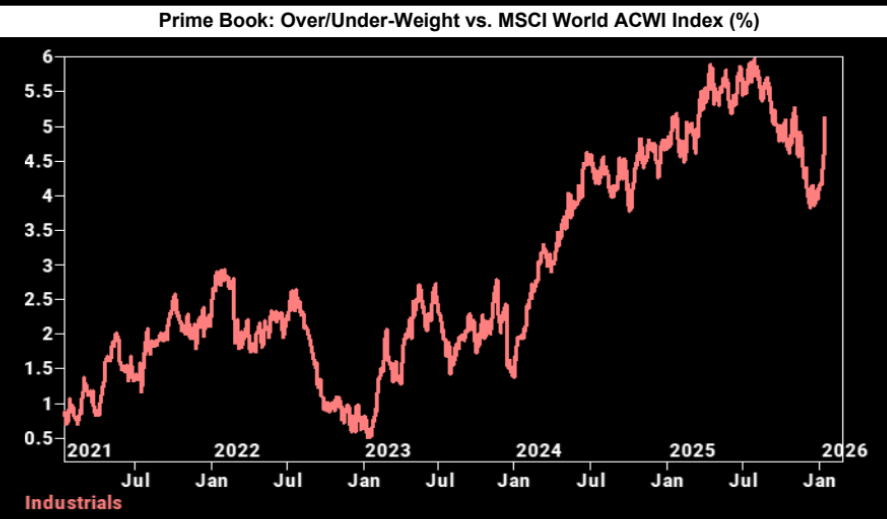 Prime brokers are singing the same tune: risk is back. Industrials and banks are being bought aggressively, leverage is climbing, shorts are getting squeezed, and reflation trades are heating up. It’s not full euphoria yet, but the re-risking is no longer subtle.