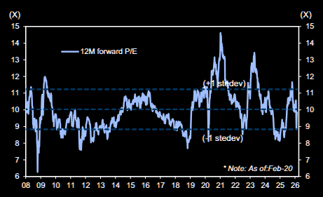 KOSPI 12m forward P/E multiple has remained below its historical average.