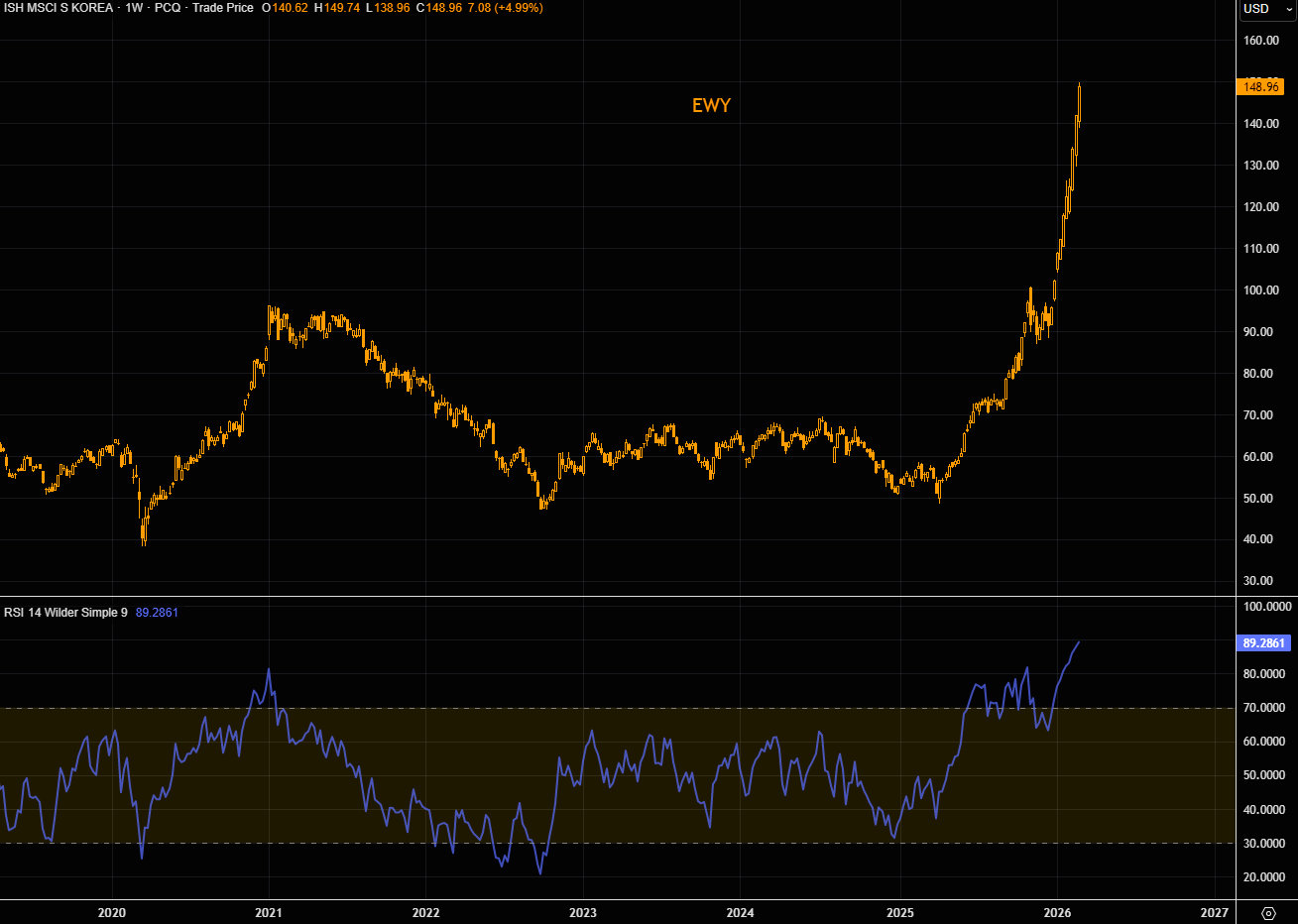 EWY weekly RSI at 89! Getting a bit extreme...even if you are bullish.