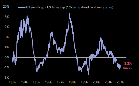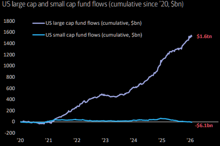 An ugly Russell candle to end the week, but zooming out, the setup still leaves room for further upside if rotation starts to pick up more meaningfully "decade-to-date $1.6tn inflow to US large cap vs. $6.1bn outflow from small cap" (BofA)