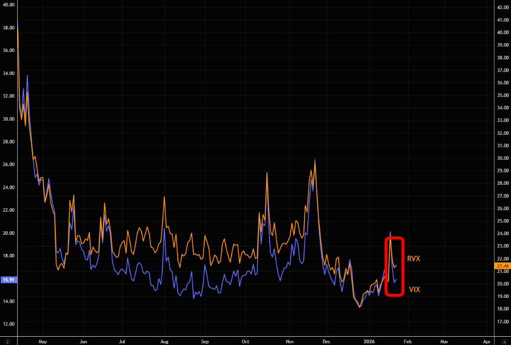 Russell volatility trading with a gap vs VIX for the first time since mid November.