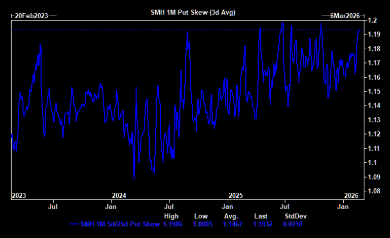 "Semis & Semi Equip has been by far the most net bought subsector on our PB pad YTD – if AI disruption continues to cause investors to take down risk, we think Semis looks extremely crowded. With 1-month 5d/25d put skew looking highly elevated, we also like put spreads in SMH to play for a more targeted pull back". (GS)