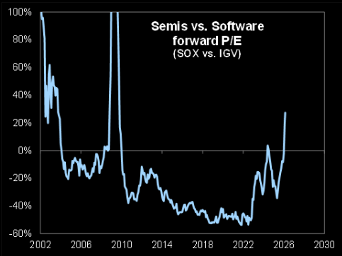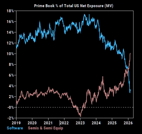 GS Prime book exposure to software has collapsed from roughly 17% at the highs to just 2% today. Meanwhile, semis exposure has surged from around 2% to nearly 10%, approaching prior peak levels.