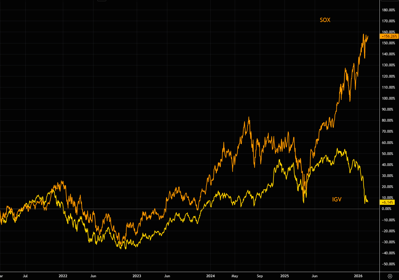 SOX vs IGV gap beyond wide. SOX has beaten semis by 150% over the past 5 years.